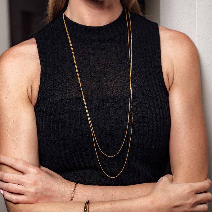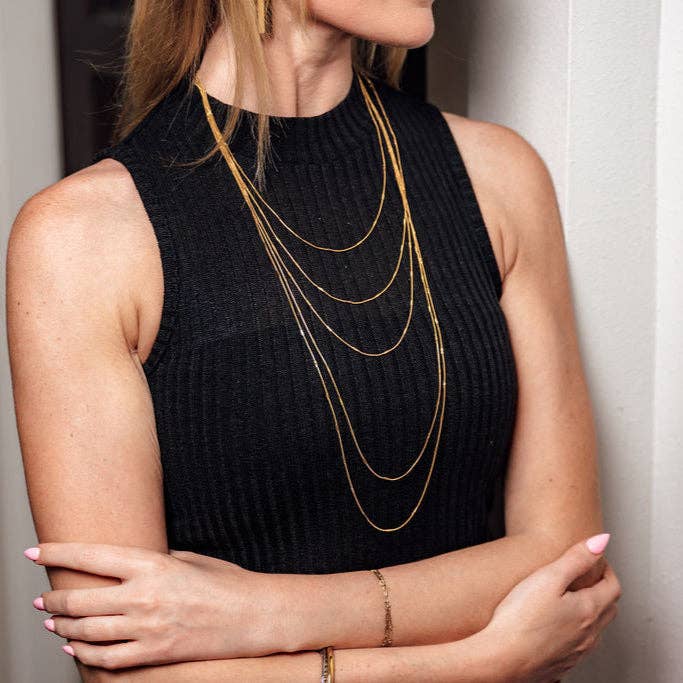 Set of 5 liquid gold necklaces. These necklaces can be worn separate or together. Mix and Match your lengths and layer with existing pieces to create your own style. Let your creativity and personality shine with this stainless steel set.